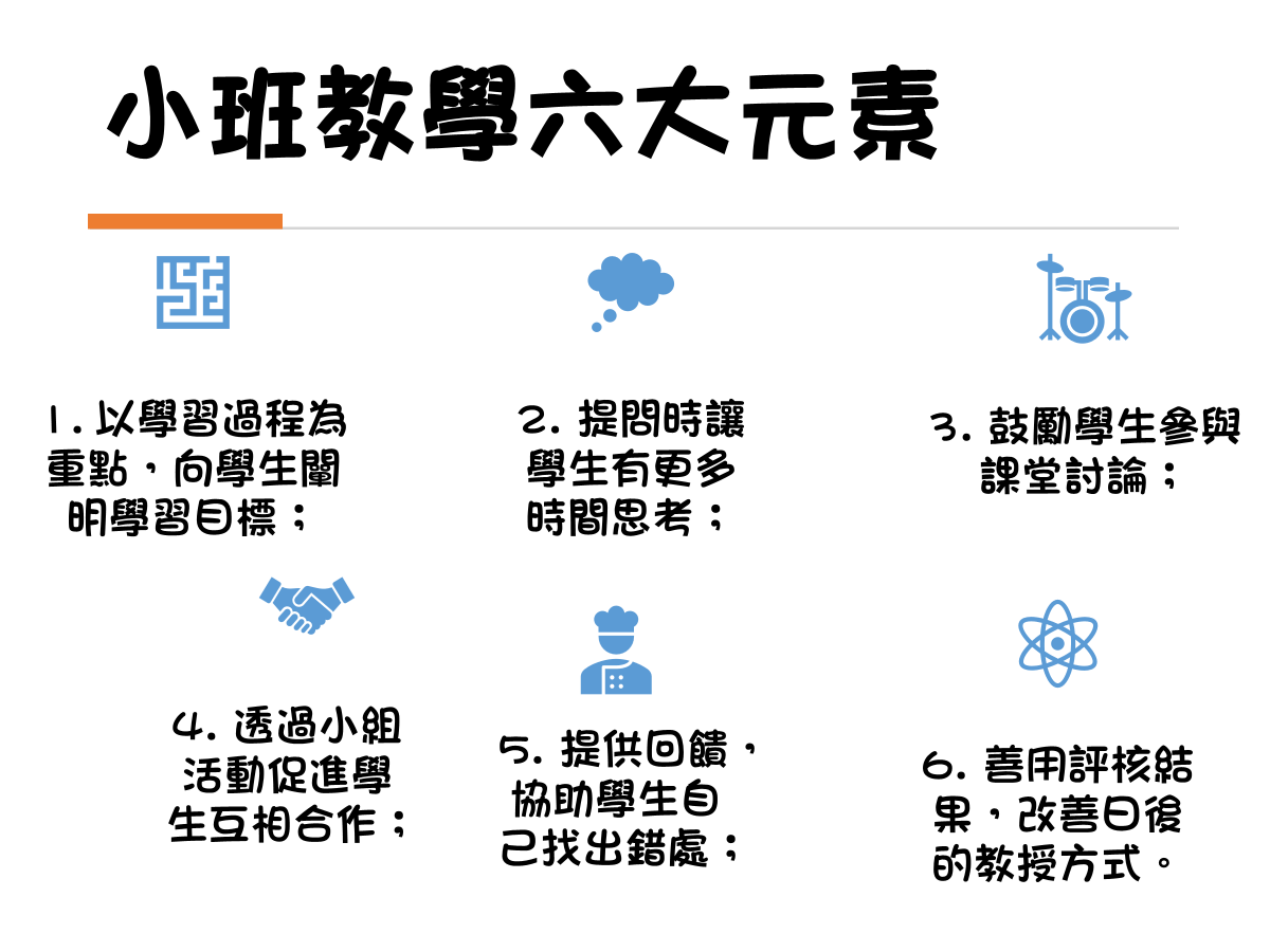 根據Prof M. Galton指出,要發揮小班教學的優勢,教師專業發展需要涵蓋以下六大要素: